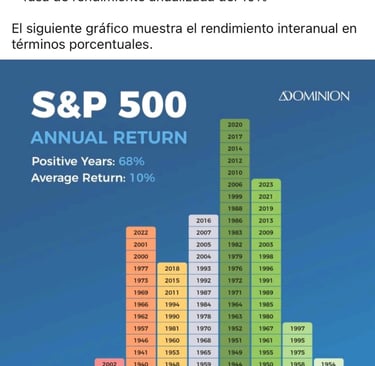 El S&P 500 ha demostrado un rendimiento promedio anualizado del 10% a lo largo del tiempo. Esto significa que, con un horizonte de inversión lo suficientemente amplio, los inversionistas podrían duplicar su capital cada 7-8 años, gracias al poder del interés compuesto.